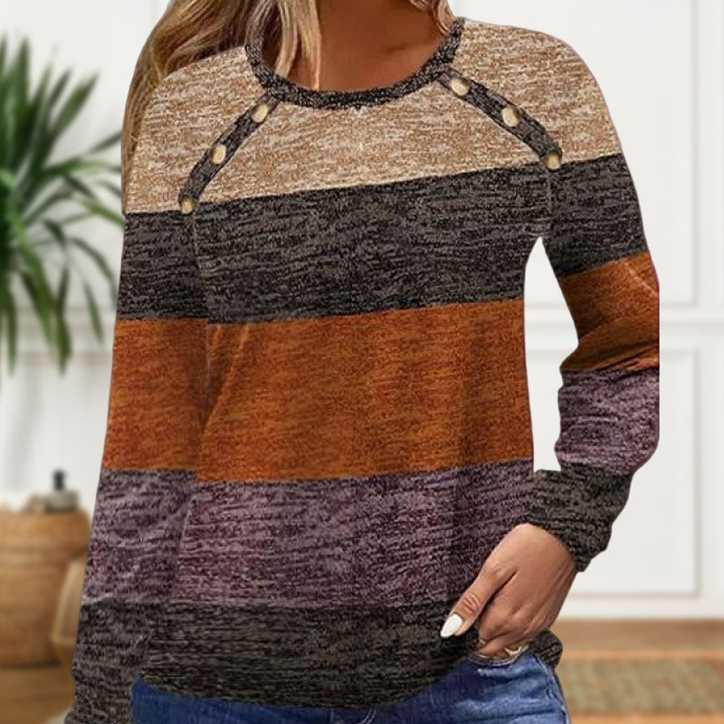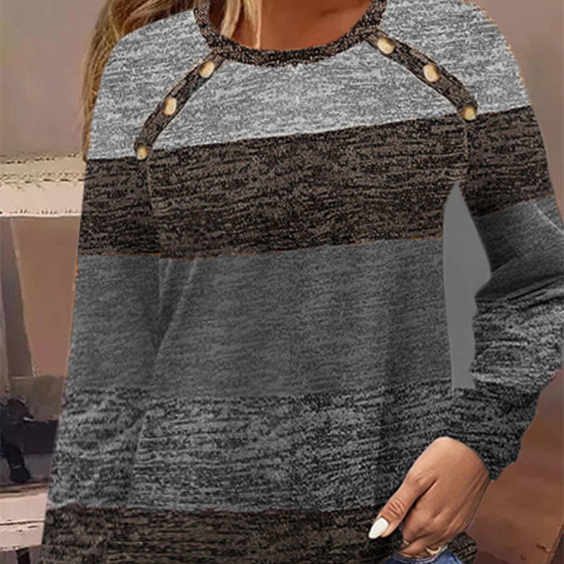 DECORATIVE BUTTONS ON FRONT: The front of the top is adorned with decorative buttons, adding a touch of elegance and detail. These buttons enhance the overall design and provide a subtle yet stylish accent that complements the color block pattern.